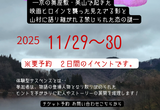 ゆっくり美山観光を楽しんだあとは、サスペンスの夜にご参加ください! 推理をするのはお客様、謎を解き明かしてください!! 興味のある方は気軽にご連絡ください。